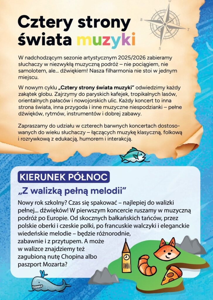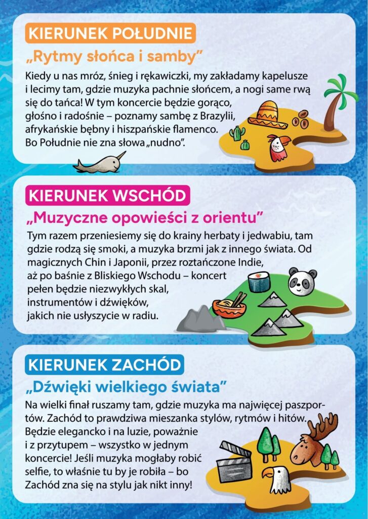 4. Wybór koncertów Wysyłając zgłoszenie rezerwują Państwo cykl 4 koncertów pn.: CZTERY STRONY ŚWIATA MUZYKI – KIERUNEK PÓŁNOC – Z walizką pełną melodii (wrzesień, październik, listopad) – KIERUNEK POŁUDNIE – Rytmy słońca i samby (grudzień, styczeń, luty) – KIERUNEK WSCHÓD – Muzyczne opowieści z orientu (luty, marzec, kwiecień)